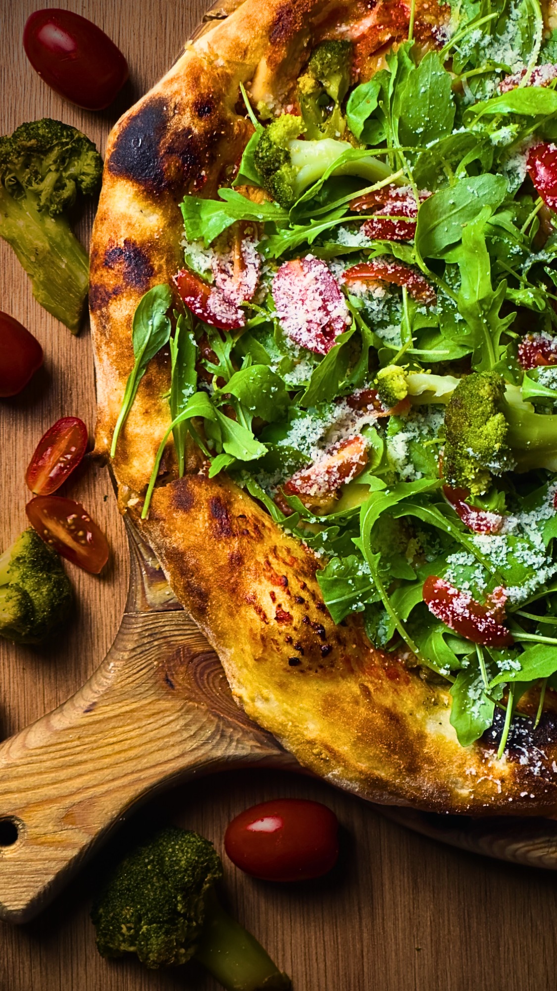 sos pomidorowy, ser fior di latte, brokuł, kurczak, pomidorki koktajlowe, rukola, mix przypraw