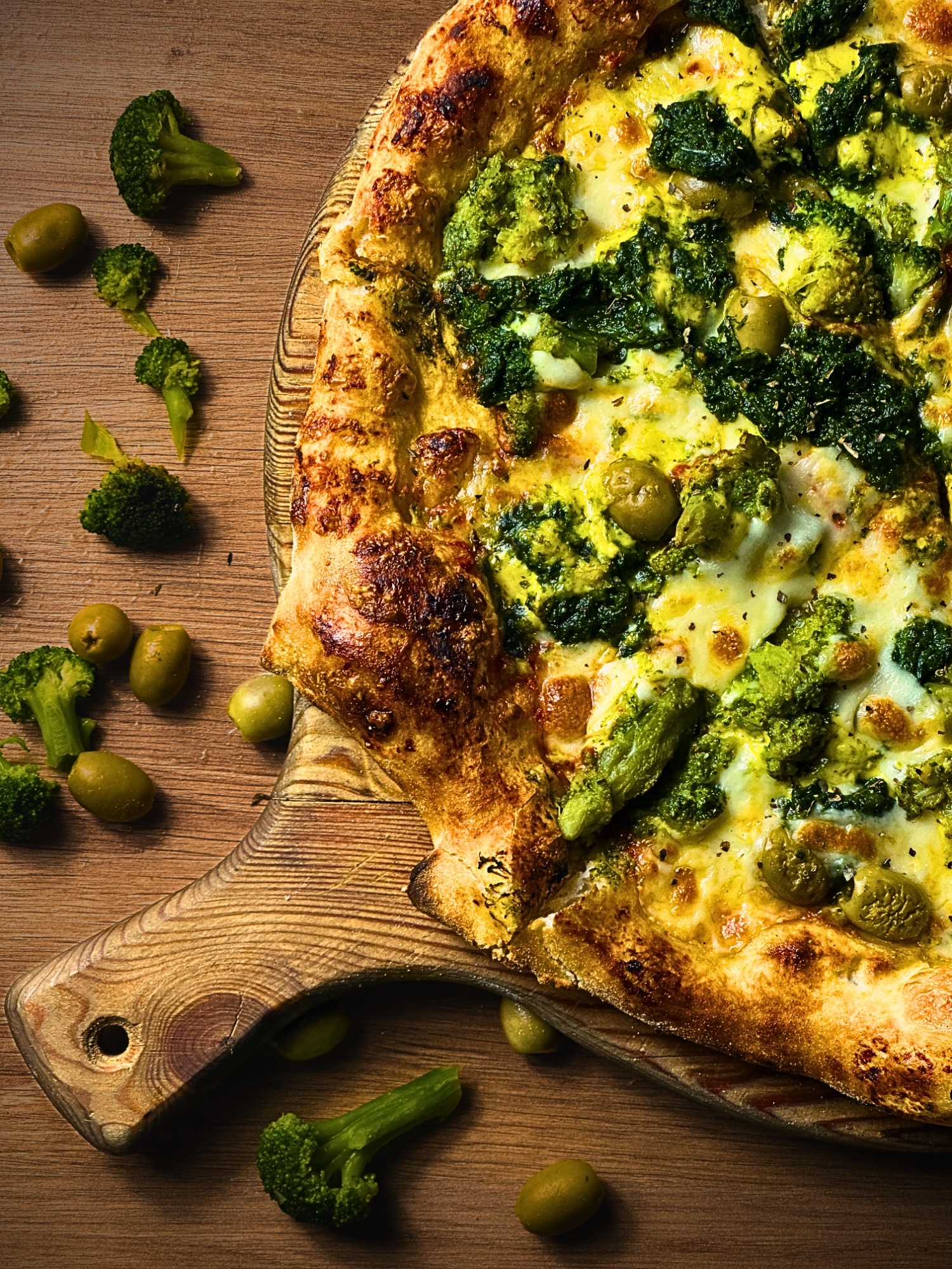 sos pomidorowy, ser fior di latte, brokuł, szpinak, lazur, oliwki zielone, mix przypraw
