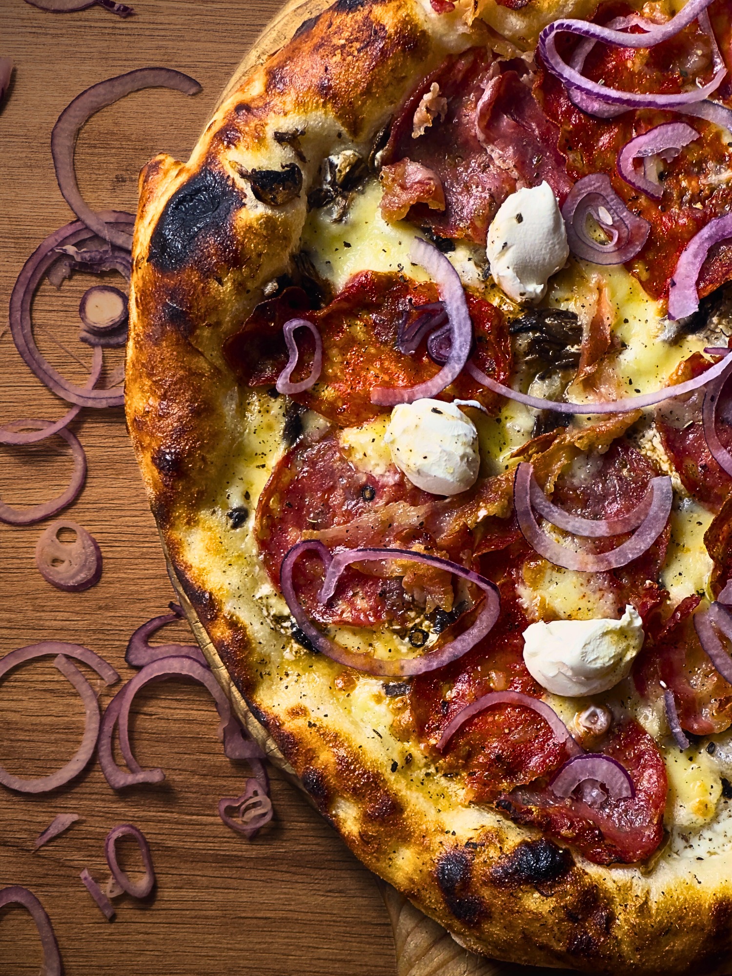 sos biały, ser fior di latte, salami piccante, boczek, serek philadelphia, gorgonzola, cebula, mix przypraw