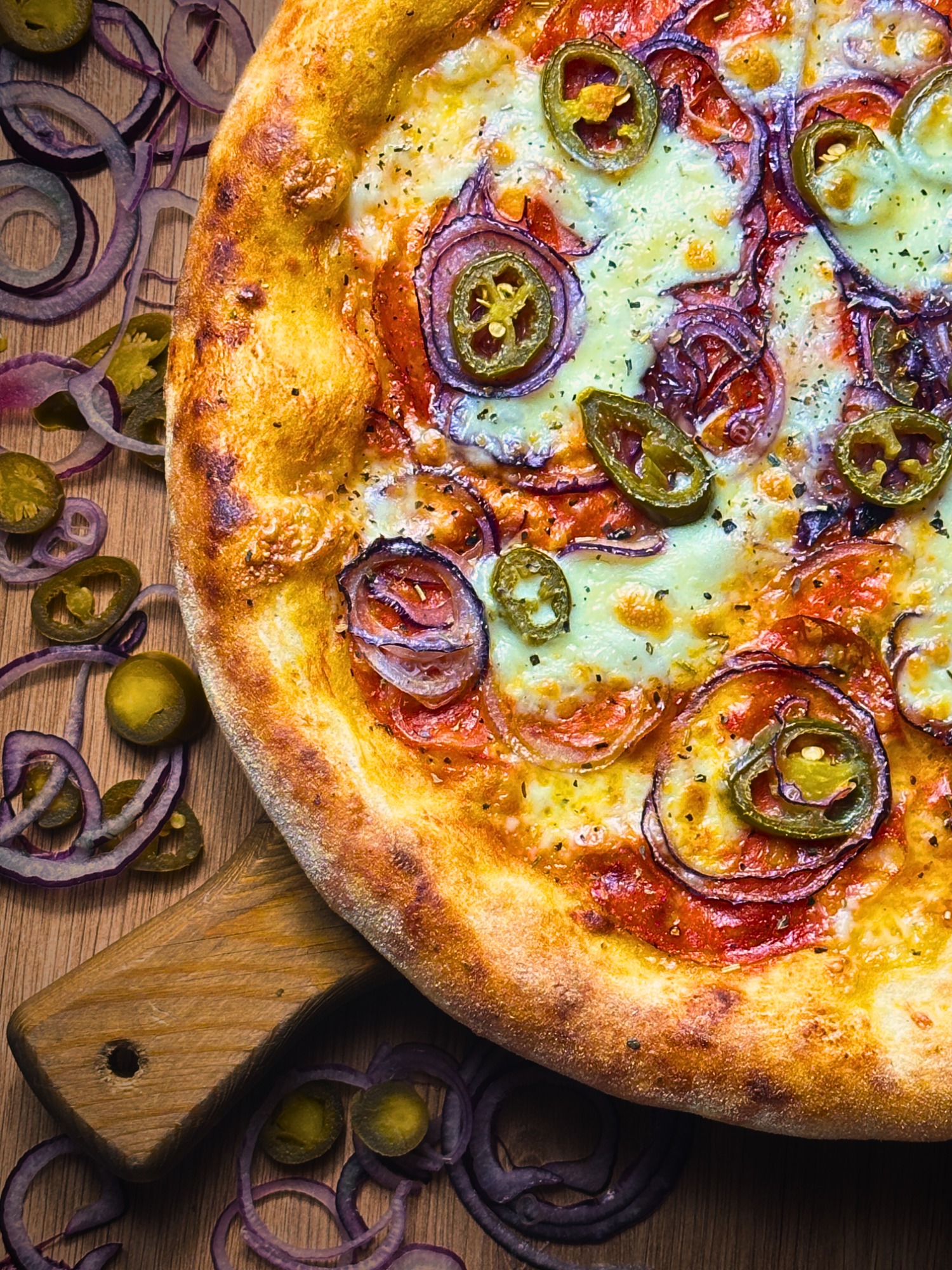 sos pomidorowy, ser fior di latte, salami piccante, czerwona cebula, jalapeno, mix przypraw