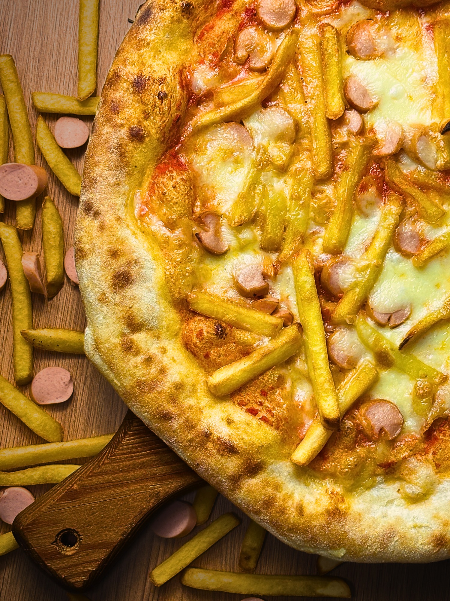 sos pomidorowy, ser fior di latte, frytki, paróweczki, mix przypraw