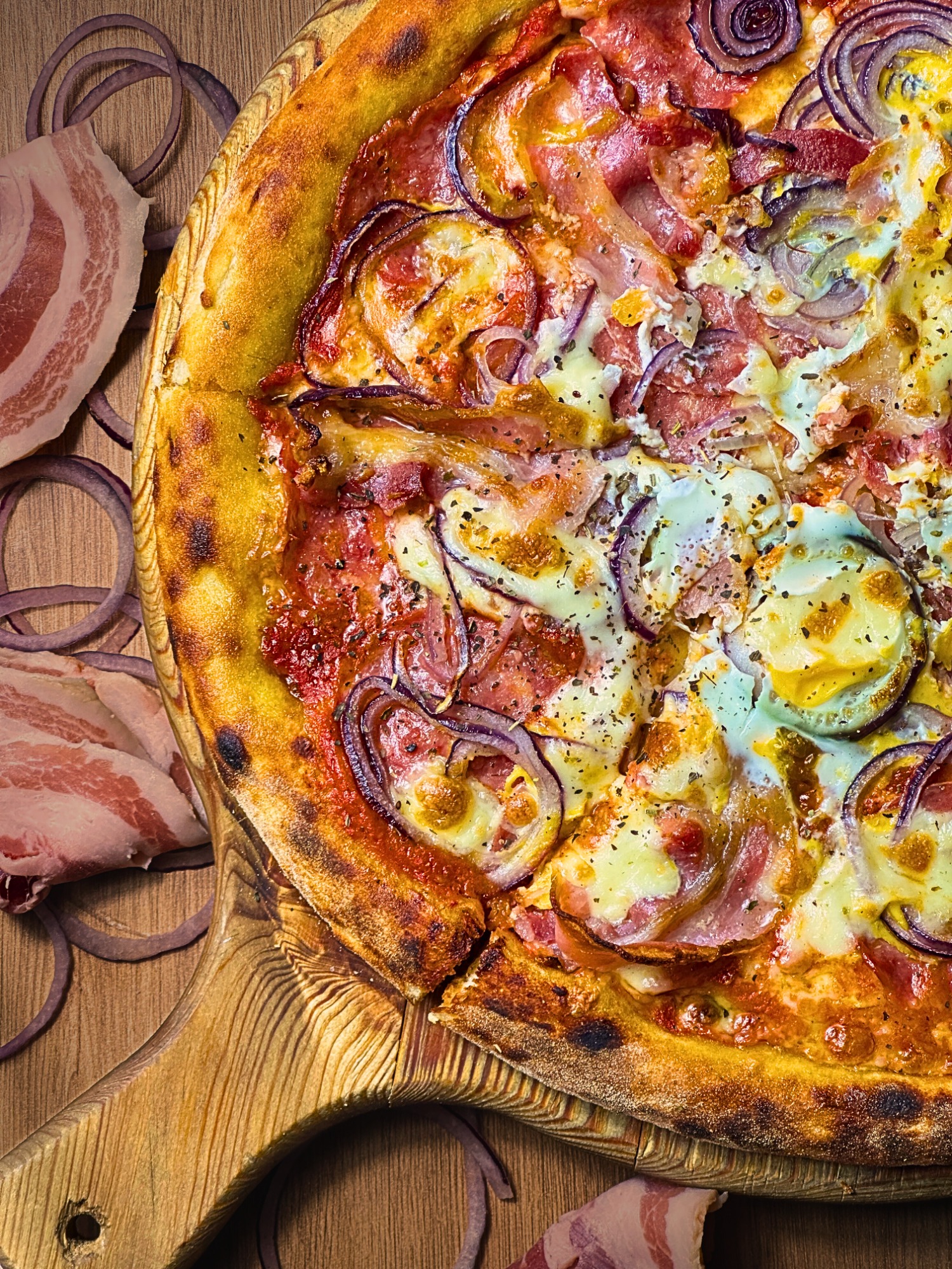 sos pomidorowy, ser fior di latte, boczek, jajko, salami, czerwona cebula, mix przypraw