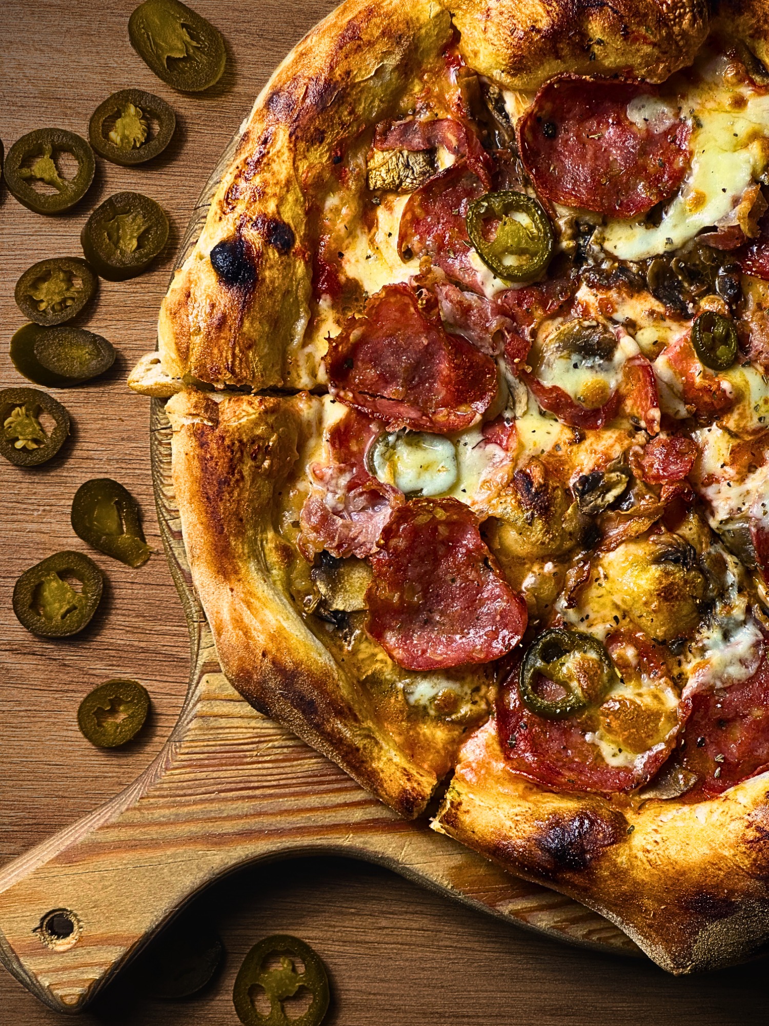 sos pomidorowy, boczek, ser fior di latte, pieczarki, salami, jalapeno, mix przypraw