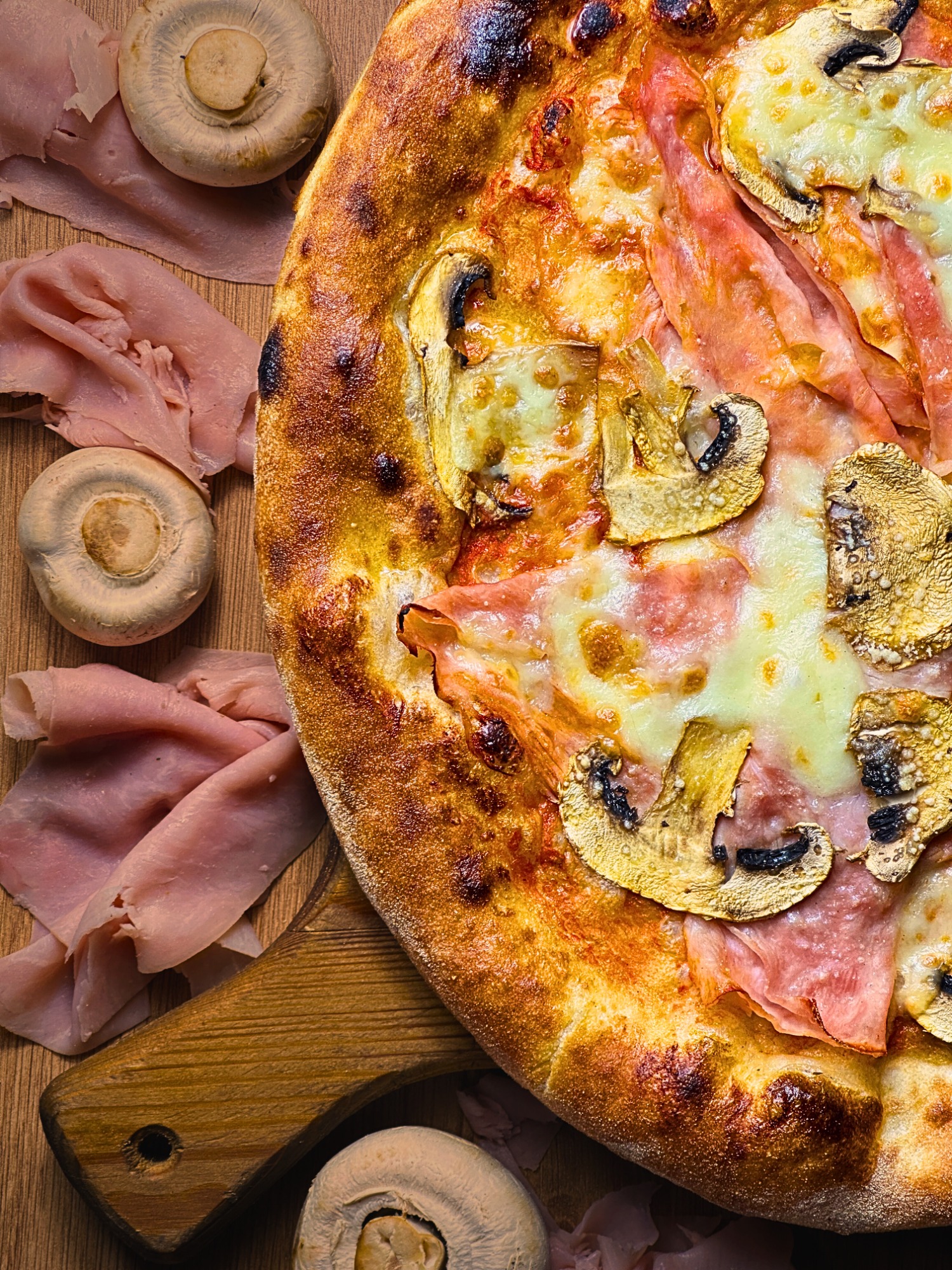 sos pomidorowy, ser fior di latte, szynka, pieczarki, jalapeno, mix przypraw